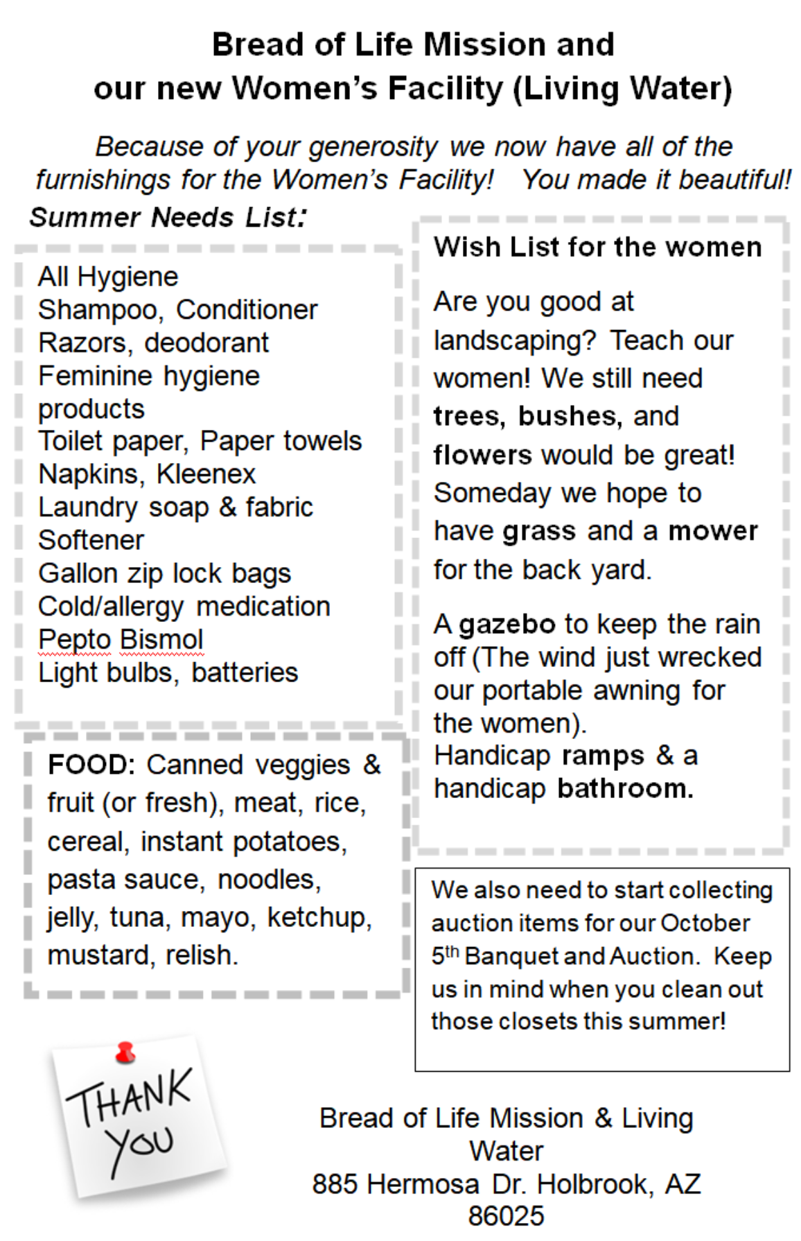 Bread of Life Mission of Holbrook 885 Hermosa Drive Holbrook, AZ 86025 Phone: (928) 524 3874 Cherise Myers - Executive Director